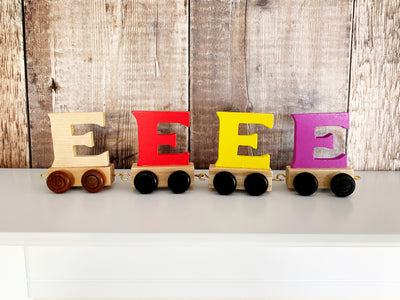 Cute little Train letters which will brighten up any Childs room, available coloured or plain wooden. You can mix and match these but please note the plain letters have natural wood coloured wheels. Please use drop down menu to choose colour.