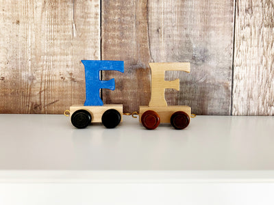 Cute little Train letters which will brighten up any Childs room, available coloured or plain wooden. You can mix and match these but please note the plain letters have natural wood coloured wheels. Please use drop down menu to choose colour.