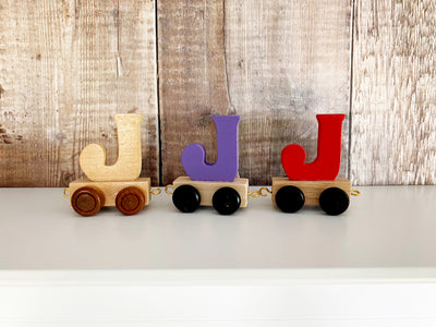 Cute little Train letters which will brighten up any Childs room, available coloured or plain wooden. You can mix and match these but please note the plain letters have natural wood coloured wheels. Please use drop down menu to choose colour.