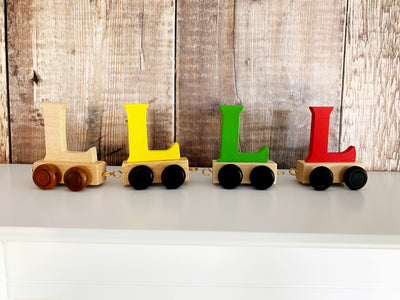 Cute little Train letters which will brighten up any Childs room, available coloured or plain wooden. You can mix and match these but please note the plain letters have natural wood coloured wheels. Please use drop down menu to choose colour.
