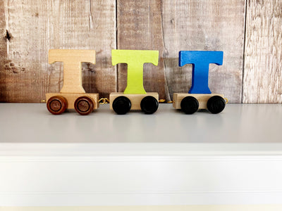 Cute little Train letters which will brighten up any Childs room, available coloured or plain wooden. You can mix and match these but please note the plain letters have natural wood coloured wheels. Please use drop down menu to choose colour.