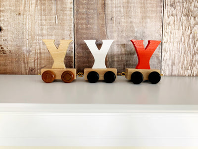 Cute little Train letters which will brighten up any Childs room, available coloured or plain wooden. You can mix and match these but please note the plain letters have natural wood coloured wheels. Please use drop down menu to choose colour.