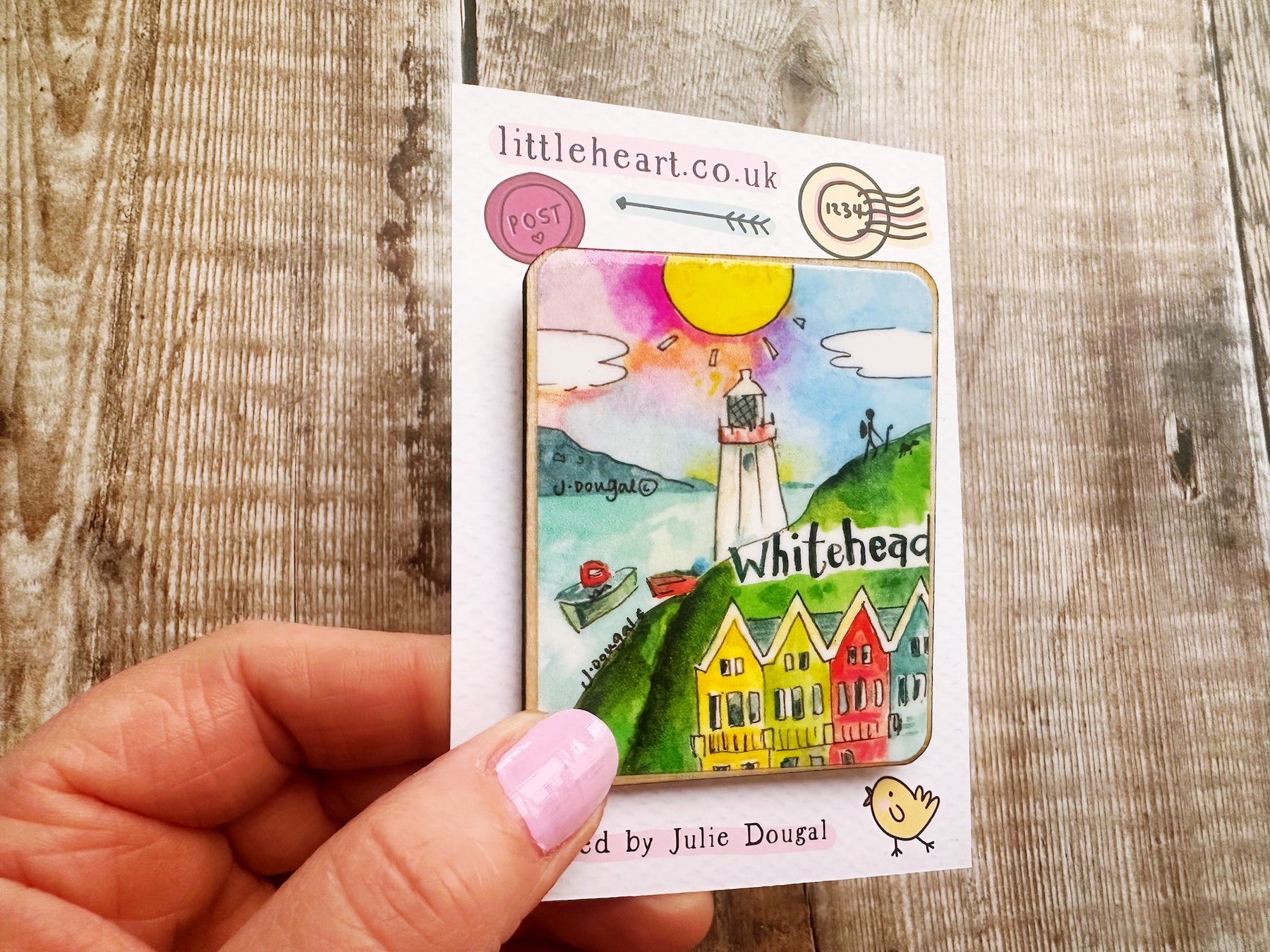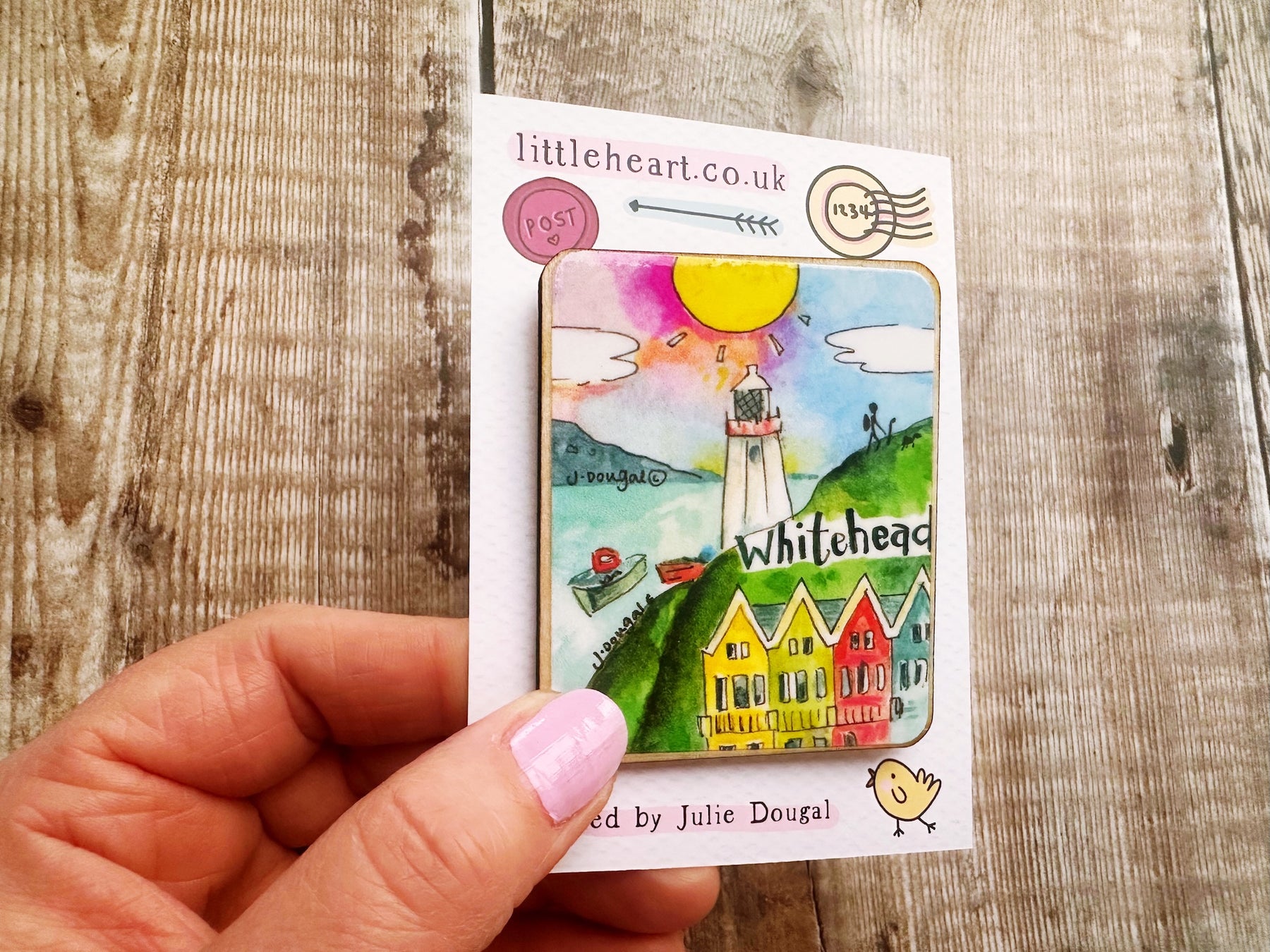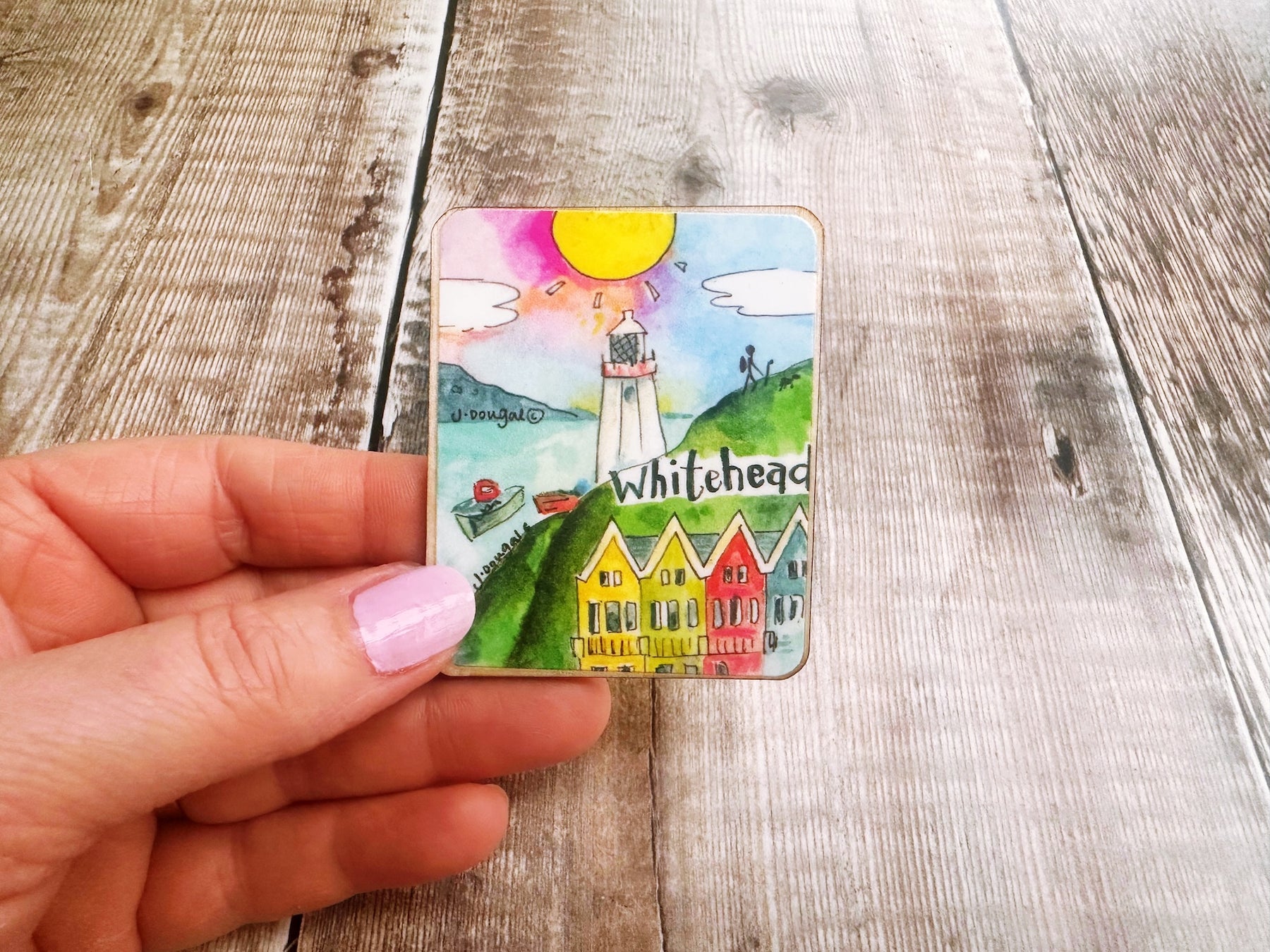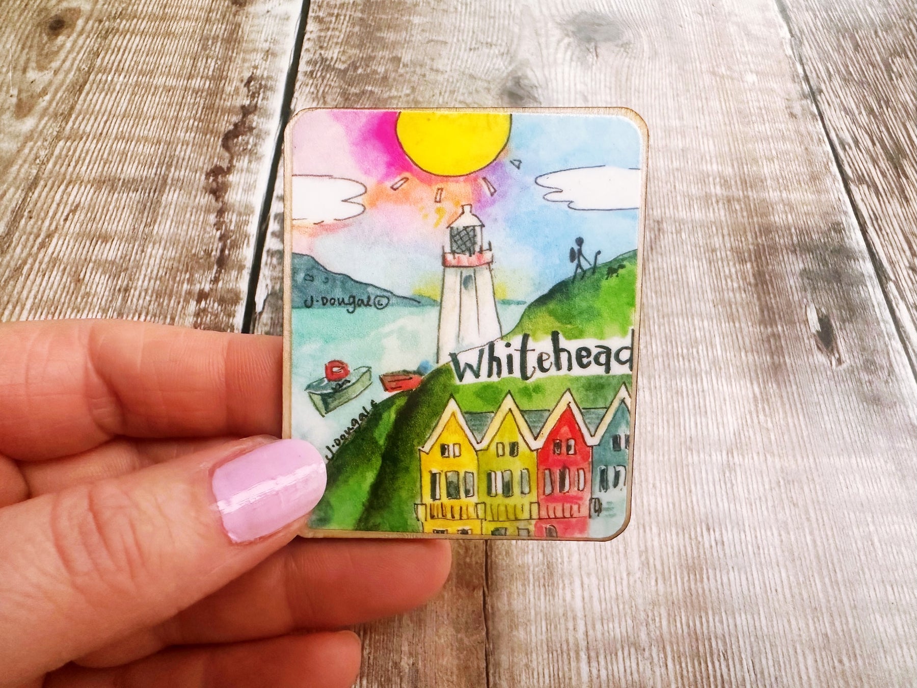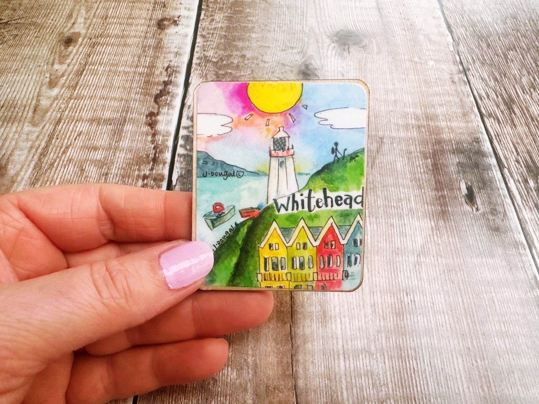 Bring a touch of Whitehead charm to your kitchen with this adorable wooden magnet! Measuring a perfectly petite 55mm x 67mm, it's the ideal size for displaying on your fridge without taking up too much space. Whether you're a local with fond memories or a visitor wanting to remember your time in this picturesque Northern Irish gem, this cute little keepsake is sure to spark conversations and smiles. A delightful way to celebrate your connection to Whitehead!