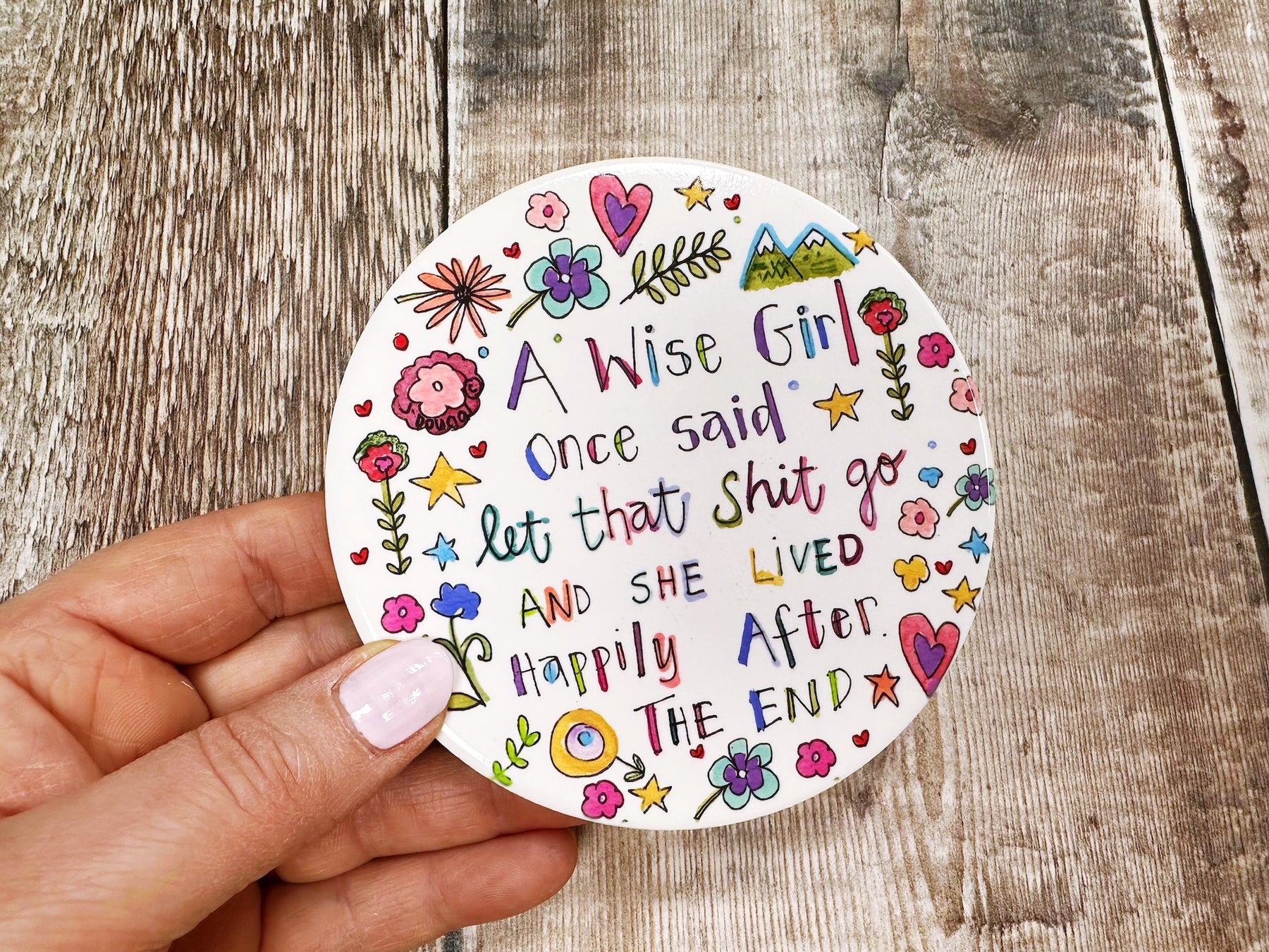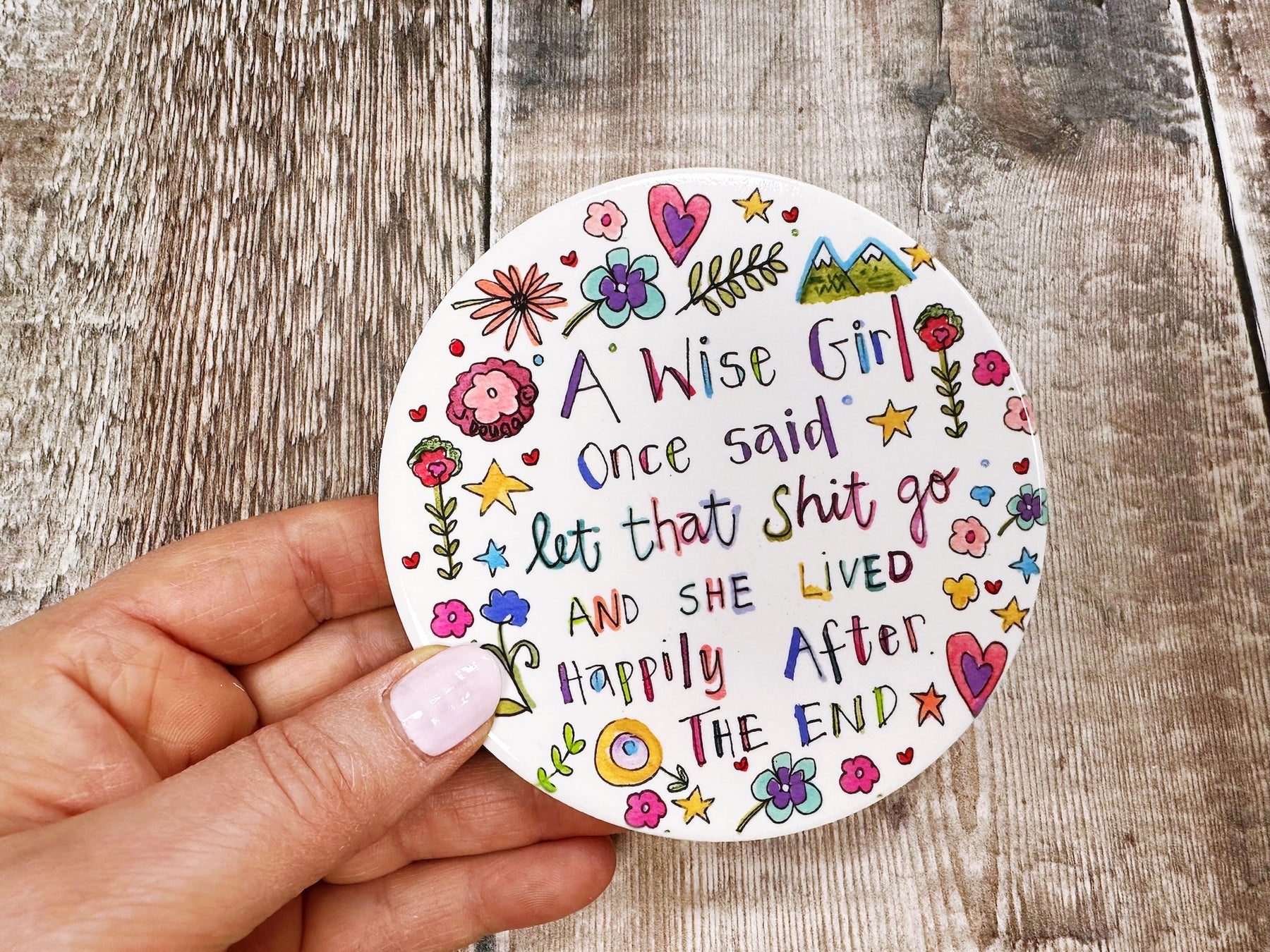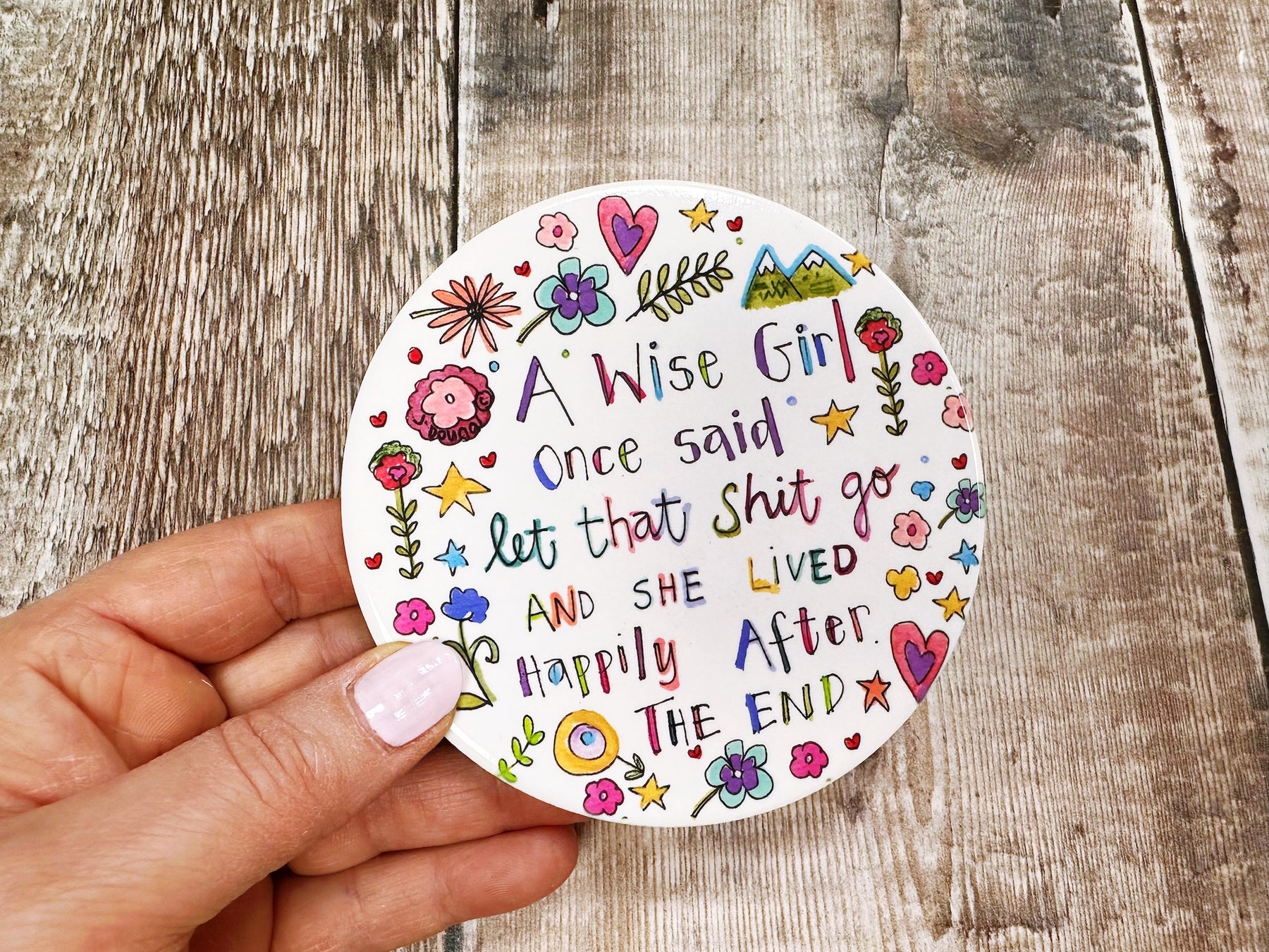 Let that Shit Go Ceramic Coaster – embrace the humour with this boldly worded piece. Crafted from durable ceramic, it protects your surfaces from drink rings and spills whilst delivering a cheeky message guaranteed to raise a laugh. Comes beautifully presented on a backing card and wrapped in cello, making it an instant gift-ready purchase. Perfect for friends with a sense of humour, housewarming presents, or adding a touch of irreverent charm to your own home.