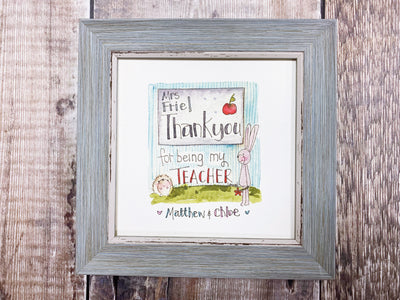 Cute little print in frame which can be personalised, these measure approximately 15.5cm to 18cm depending on the frame you choose. All pictures can be put in any frame, you can choose which one you like. Each picture is personalised if you wish and they are all designed by Julie Dougal.