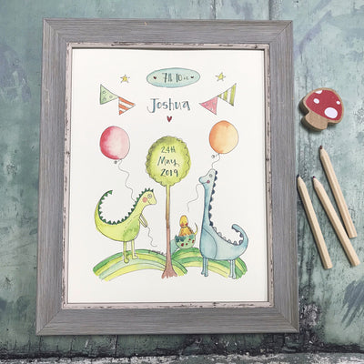 Little Dinosaur. This can be personalised with Name, Date of Birth and Weight. Designed and painted by Julie Dougal. Lovely when framed which is extra. We can also use for Christening, please let us know if you want us to write Christening on the print instead of Birth Details.