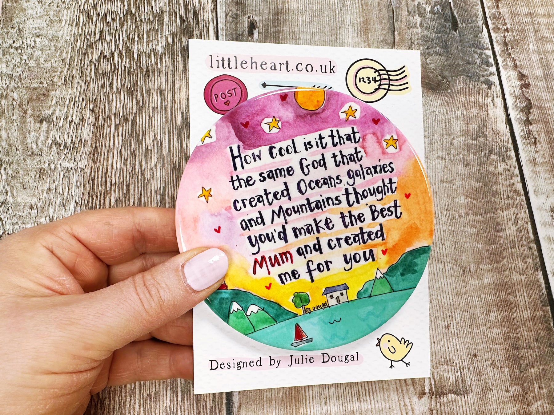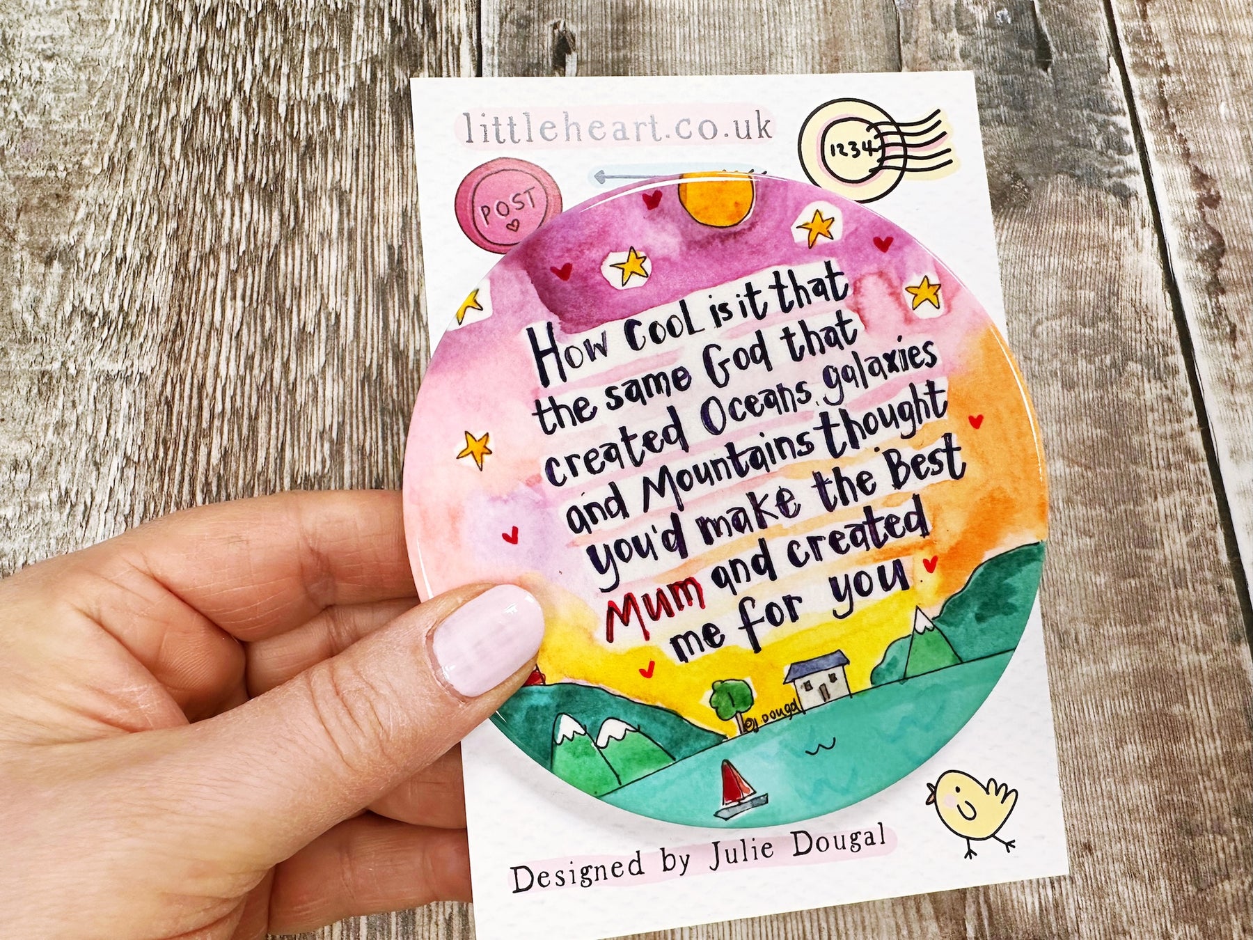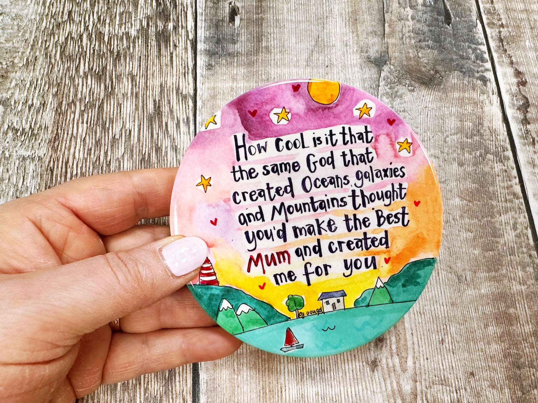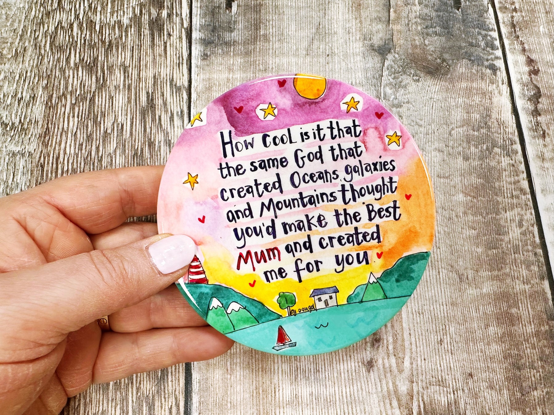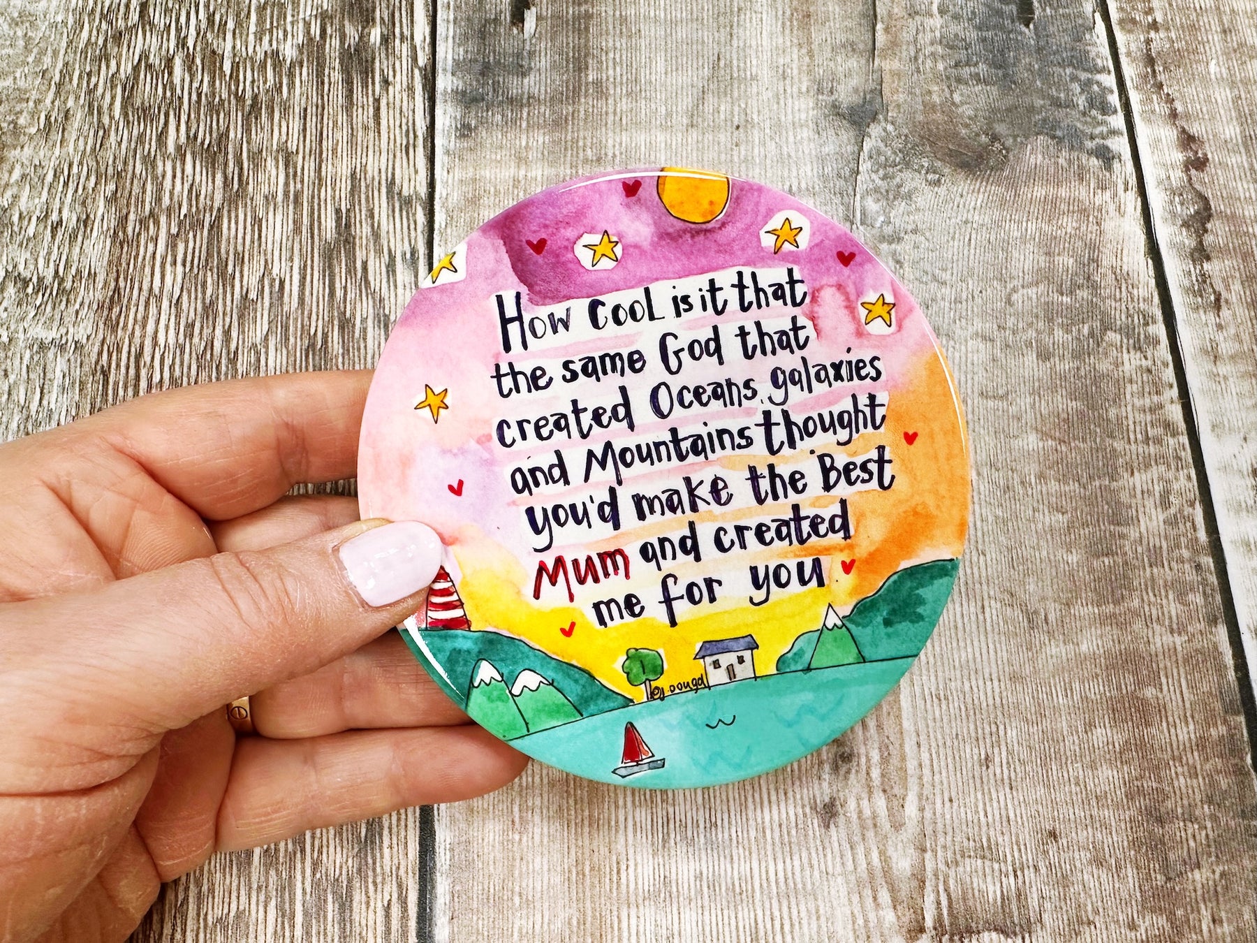 God created Mum too ceramic coaster brings warmth and protection to any home. These charming round coasters feature a heartfelt design celebrating motherhood, crafted from quality ceramic with a protective cork base to safeguard your furniture. At approximately 107mm, they're perfectly sized for mugs, glasses, and cups. Each coaster arrives with a lovely backing card, making it an ideal gift that combines practicality with sentimental value. A thoughtful way to show appreciation while adding a touch of love to everyday moments.