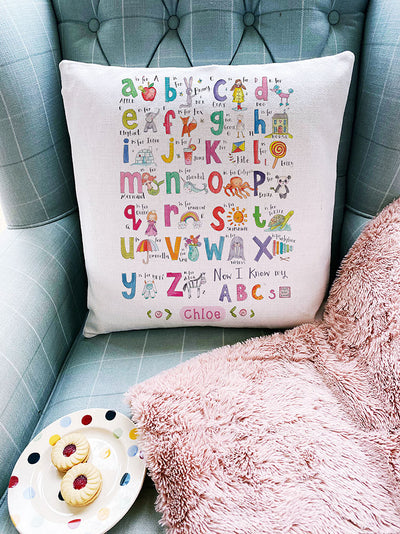 Our cute Alphabet print is now on a cushion, this version is more girly but we will have a boy version soon. We can add a Date of Birth if you wish. This image CANNOT BE EDITED. Please choose whether you want it as a cover or padded. The back of cushion is covered in little spots.