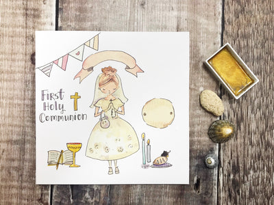 First Holy Communion New Standing Blonde Hair, Little Girl Card - Personalised