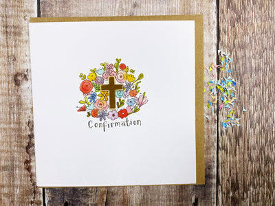 Beautiful Gold laser cut acrylic cross on a background of little Flowers. Can be personalised.