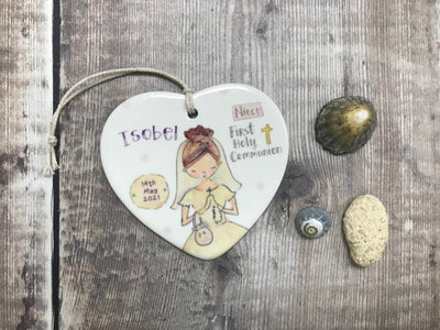 First Holy Communion Girl Dark Hair Ceramic Heart