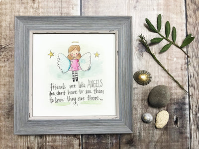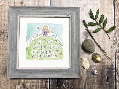 Cute little print in frame which can be personalised, these measure approximately 15.5cm to 18cm depending on the frame you choose. All pictures can be put in any frame, you can choose which one you like. Each picture is personalised if you wish and they are all designed by Julie Dougal.